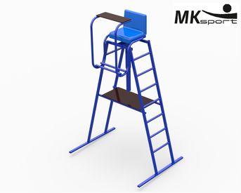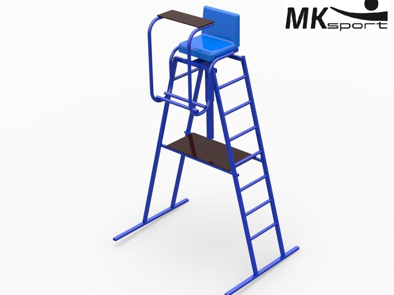 Универсальная вышка для судейства спортивных матчей и соревнований. Положение судьи сидя. Каркас вышки изготовлен из профильных труб 60*60*2, 50*50*2, 40*25*2, 25*25*1,5 и 32*3 мм. Сиденье пластиковое Лужники синего цвета. Для удобства судейства вышка оборудована столиком из ламинированной фанеры, а также полкой для хранения инвентаря, изготовленной также из многослойной ламинированной фанеры. Стандартный цвет вышки синий.