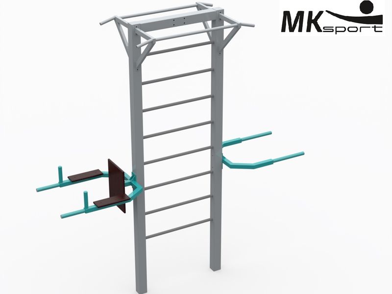 Уличный гимнастический комплекс предназначен для установки на спортивных площадках, стадионах и во дворах. Он состоит из 4 самых востребованных снарядов: шведской стенки, турника, брусьев для отжиманий и упора для пресса. Каркас комплекса изготовлен из профильных труб 80*80*3 и 40*40*2 мм. Турник, перекладины и брусья выполнены из круглых труб 32*3 и 27*3 мм. Материал спинки и подлокотников – влагостойкая ламинированная фанера. Стандартный цвет изделия – серый и бирюзовый.